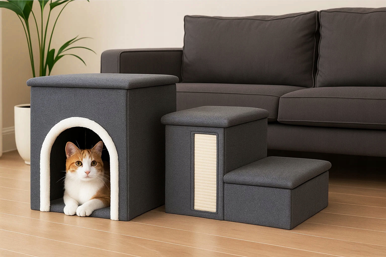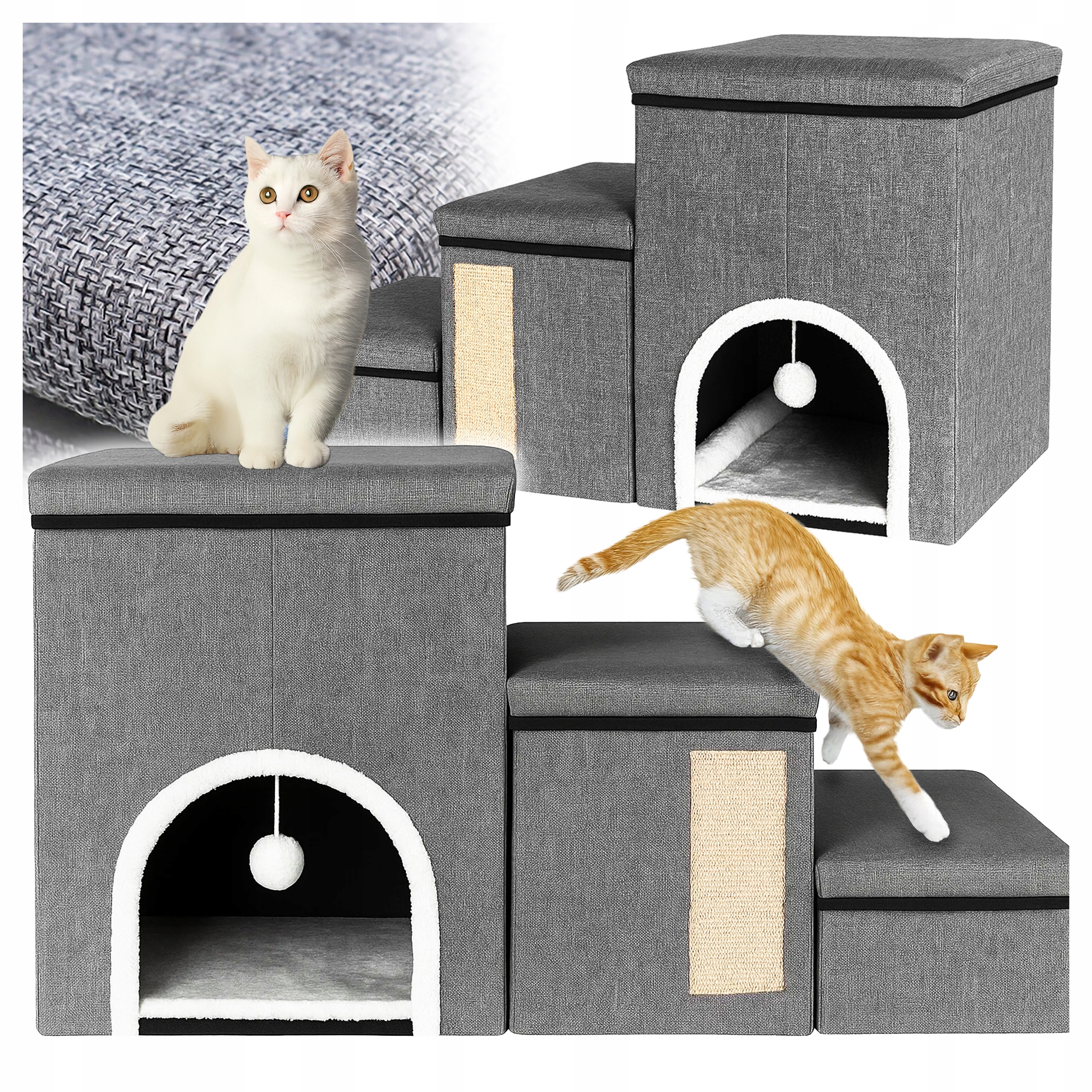 Specificatii tehnice Functie: ansamblu 3in1 – trepte, casuta, panou sisal Acces: 3 trepte pentru urcare usoara Elemente: casuta cu legowisko, panou sisal, mingiuta suspendata Material: MDF, plus, sisal Dimensiuni: 33x76x42 cm Constructie: pliabila pentru depozitare si transport Design: modern, neutru, potrivit pentru orice interior Ambalare: produs in cutie, stare originala Scurta descriere Ansamblu multifunctional pentru pisici cu trepte pentru acces facil, casuta confortabila pentru odihna, panou sisal pentru zgariat si mingiuta pentru joaca. Ideal pentru stimulare, relaxare si protectia mobilierului. Caracteristici principale Trepte pentru urcare usoara Casuta cu legowisko confortabil Panou sisal pentru zgariat Mingiuta suspendata pentru joaca Constructie pliabila Design modern si stabil