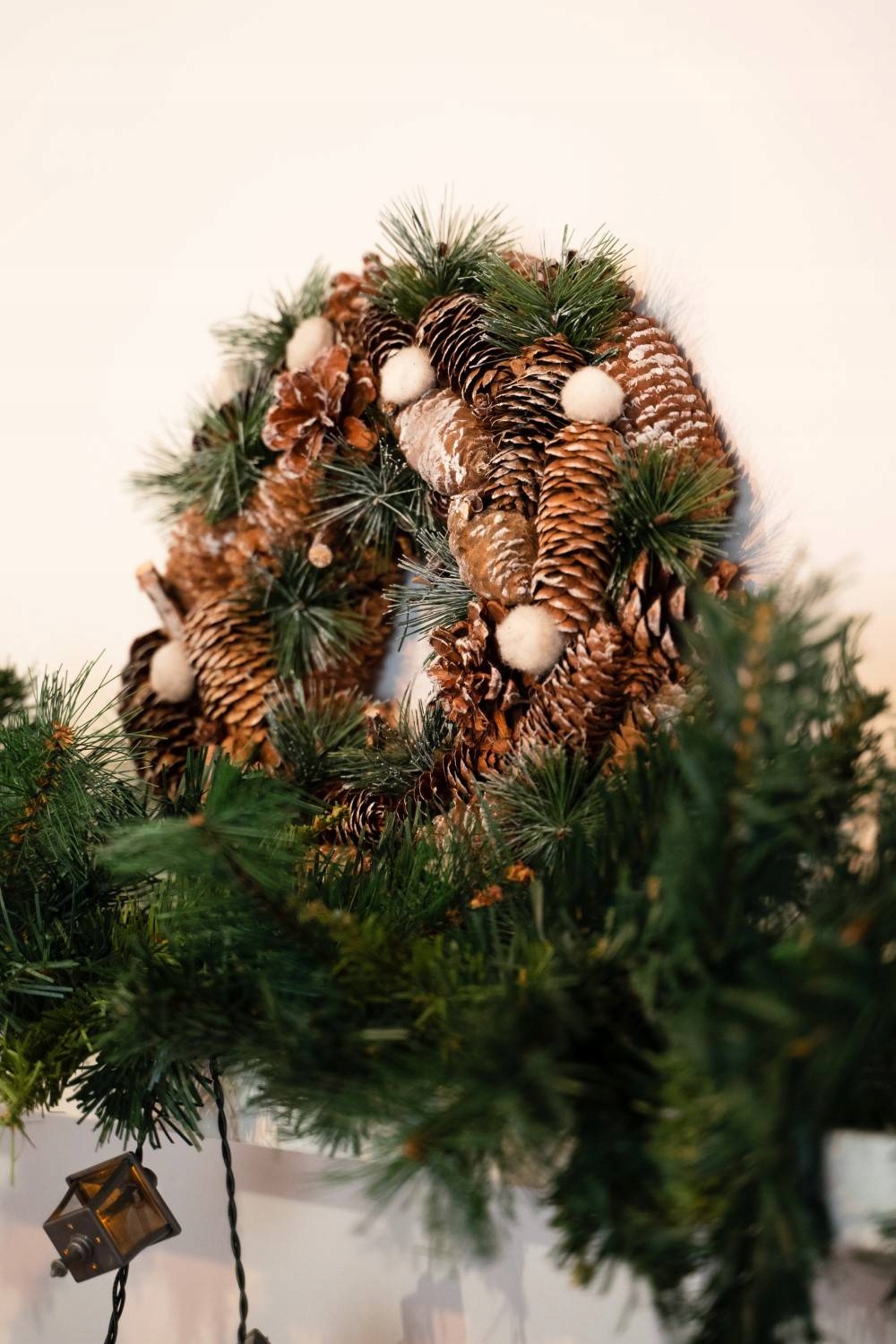 Coronita decorativa cu conuri si ramuri cu sclipici, diametru 34 cm, bej