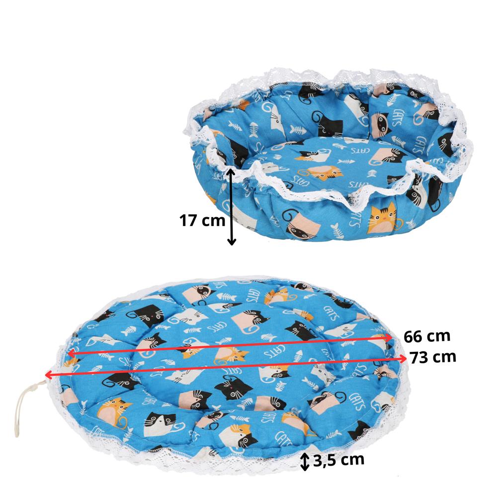 Specificatii tehnice Material: poliester Culoare: albastru, alb, negru, tonuri de portocaliu Diametru total: 73 cm Diametru fara margine decorativa: 66 cm Latime margine decorativa: 3.5 cm Diametru baza (strans): 38 cm Inaltime perete cu margine: aprox. 17 cm Diametru deschidere (strans): aprox. 45 cm Mod utilizare: mata sau culcus cu pereti Sistem ajustare: snur pentru strangere Scurta descriere Culcus multifunctional pentru animale de companie, realizat din poliester moale si placut la atingere. Poate fi folosit fie ca mata de relaxare, fie ca culcus cu pereti prin strangerea snurului integrat. Ofera confort ridicat si izolare usoara datorita materialului pufos si flexibil. Caracteristici principale Material moale si placut la atingere Utilizare 2 in 1: mata sau culcus cu pereti Sistem cu snur pentru ajustare rapida Margine decorativa eleganta Potrivit pentru pisici si caini de talie mica Design colorat si atractiv Usor de mutat si de curatat