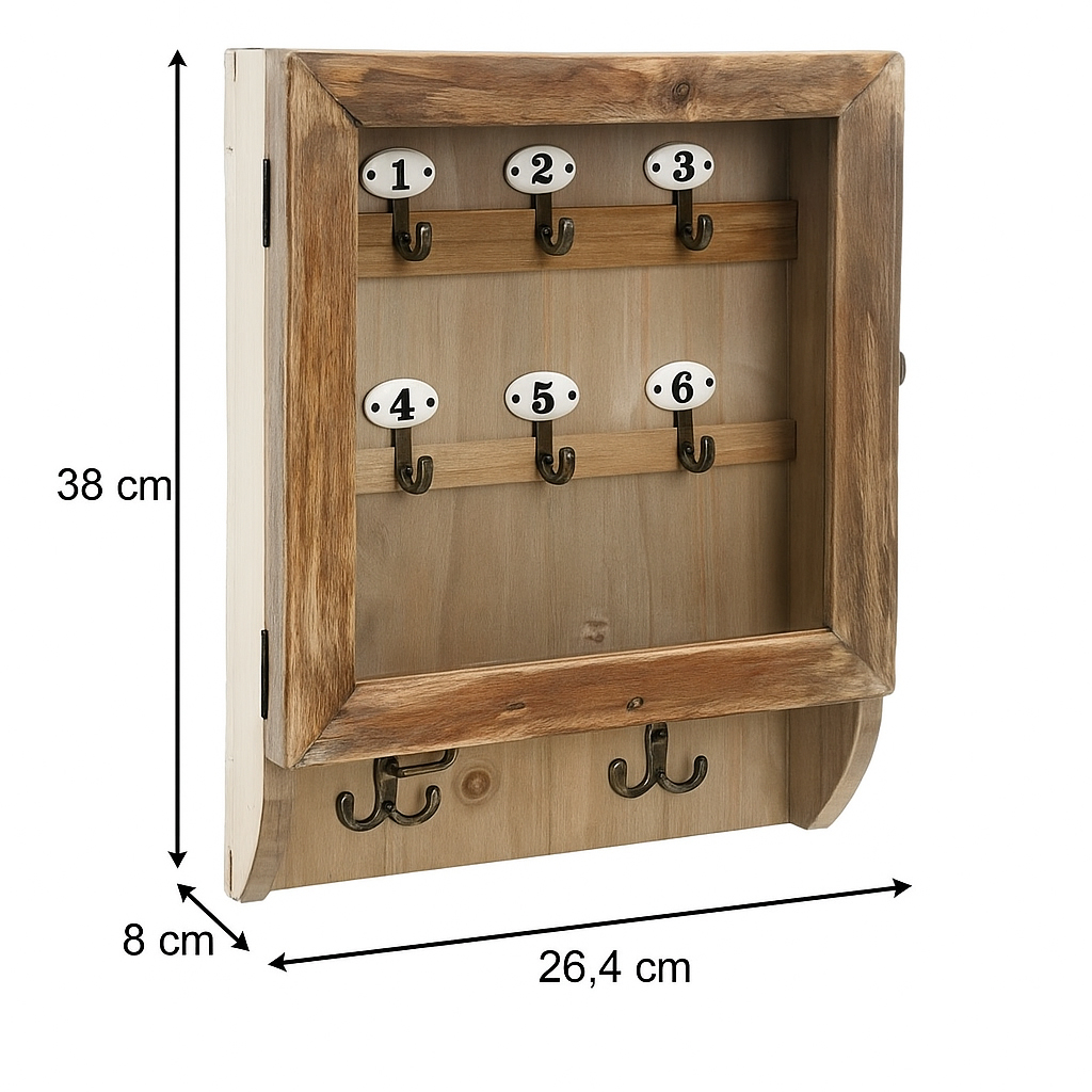 Specificatii tehnice: Marca: Atmosphera Model: Ornella Culoare: Natur Material: Lemn de brad, panou compozit, sticla, carlige din fier Dimensiuni produs: L.26,4 x P.8 x H.38 cm Greutate produs: 1,45 kg Asamblare: Nu Scurta descriere: Cutia de chei Ornella de la Atmosphera aduce un aer vintage autentic. Realizata din lemn de brad cu usa din sticla si 8 carlige (interior si exterior), aceasta piesa retro este ideala pentru organizarea eleganta a cheilor in hol sau spatii de inspiratie clasica. Caracteristici principale: Structura din lemn de brad si panou compozit 6 carlige numerotate in interior, 2 carlige duble in exterior Usa cu sticla si inchidere cu sistem tip vechi din metal Design retro, perfect pentru decor clasic sau vintage Accesoriu functional si decorativ pentru hol