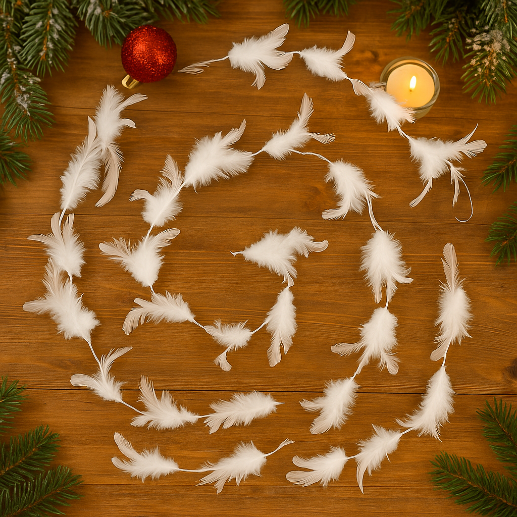 Prima pagină Disponibil livrare locker Ghirlanda pentru decor sau bradul de Craciun, model puf si pene, 200cm, alb