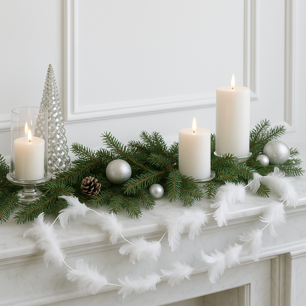 Ghirlanda pentru decor sau bradul de Craciun, model puf si pene, 180cm, alb