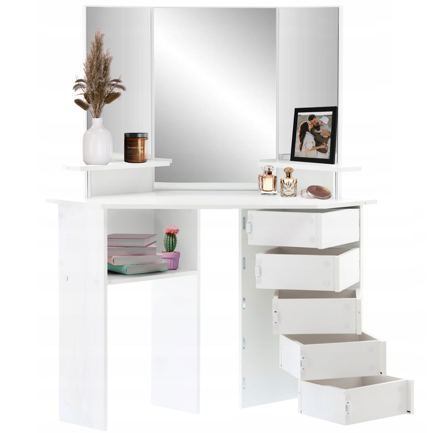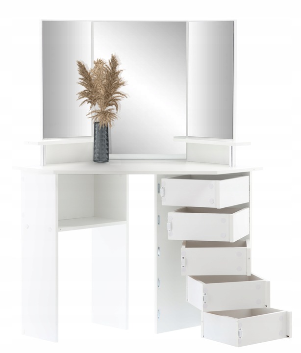 Masa de toaleta pentru colt, cu oglinda si rafturi, 5 sertare practice cu balamale, 111x54x142cm, alb
