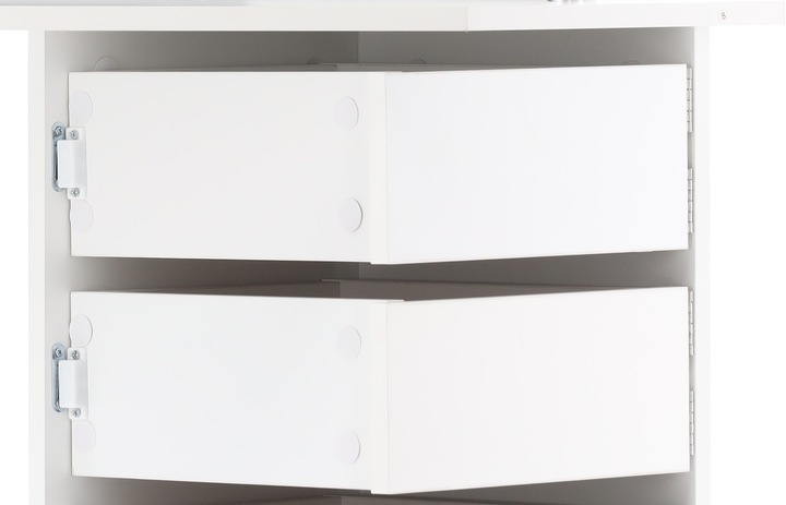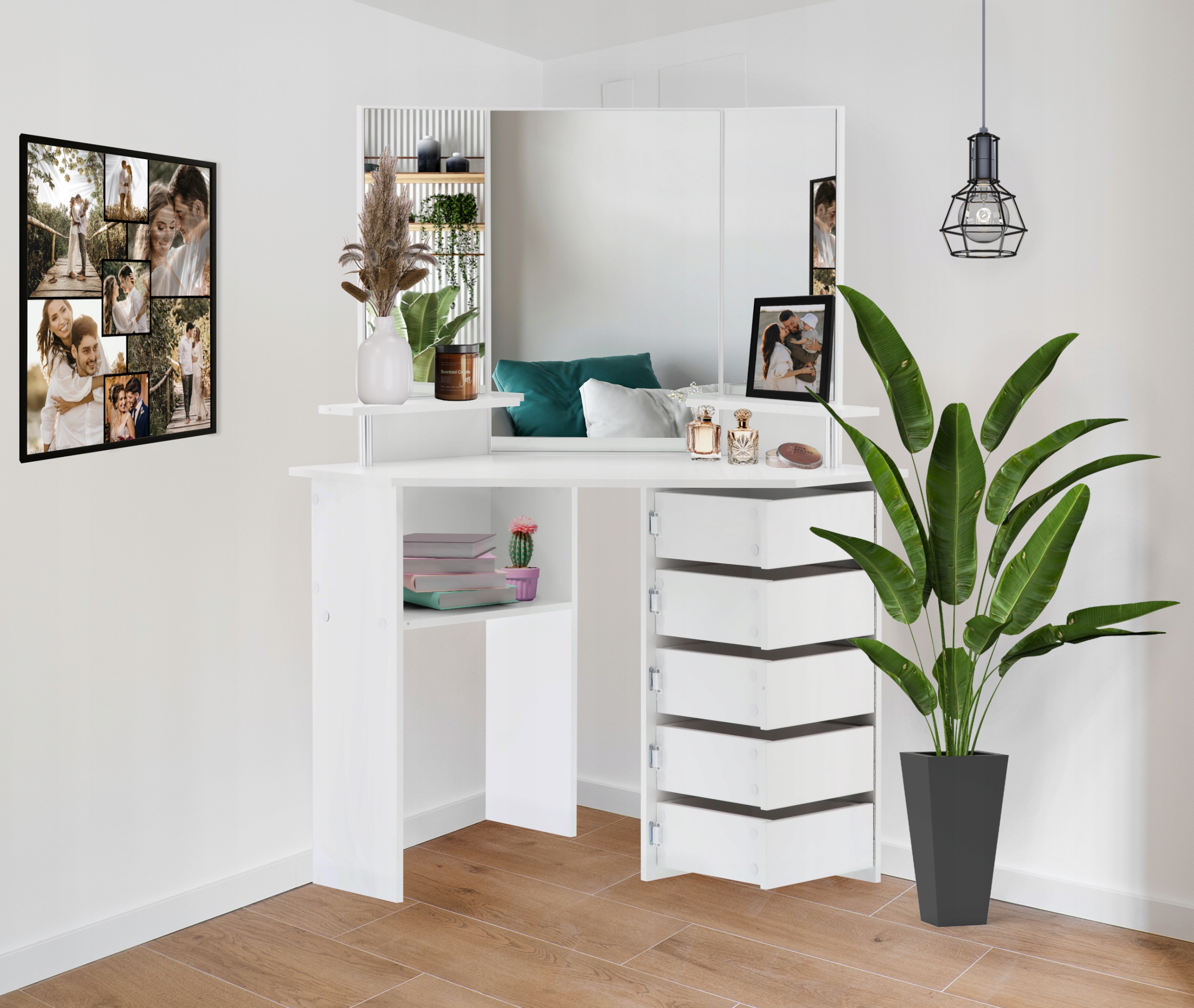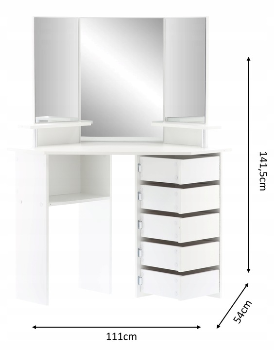 * Nu include decoratiunile (rame foto, carti, parfumuri etc) Dimensiuni: Lungime: 111 cm Latime: 54 cm Inaltime: 141,5 cm Visezi la un loc elegant pentru ingrijirea zilnica si depozitarea convenabila a produselor cosmetice ? Aceasta masuta de toaleta de colt eleganta va fi un plus perfect pentru dormitorul sau baia dvs. , oferind nu numai functionalitate, ci si un aspect estetic. O masuta de toaleta cosmetica de colt alb cu oglinda este o solutie eleganta si practica care se incadreaza perfect in aranjamentele moderne de baie sau dormitor . Ofera functionalitate si estetica, creand in acelasi timp un spatiu confortabil pentru ritualurile zilnice de ingrijire. Dimensiunile mesei de toaleta o fac sa se incadreze perfect in colturile incaperilor, optimizand in acelasi timp spatiul disponibil. Designul sau compact nu numai ca economiseste spatiu, dar ofera si interiorului un caracter modern. Fabricat din placi MDF rezistente, garantand stabilitate si durabilitate. Culoarea alba confera eleganta si face ca masa de toaleta sa fie potrivita pentru multe tipuri de interioare, adaugand acestora prospetime. O oglinda mare amplasata central deasupra mesei de toaleta si 2 oglinzi laterale faciliteaza machiajul si coafarea de zi cu zi. Merita subliniat faptul ca masa de toaleta este echipata cu o oglinda mare care va permite sa va verificati cu atentie aspectul in timpul ritualurilor zilnice de frumusete. O oglinda nu este doar un element functional, ci si un decor eficient care mareste optic spatiul. Design ergonomic: Forma de colt a mesei de toaleta economiseste spatiu, asigurand in acelasi timp confortul de utilizare. Aspect estetic: Linia de design simpla, dar eleganta, face ca masuta de toaleta sa se potriveasca perfect in orice interior.Fata mesei de toaleta este decorata cu o suprafata alba eleganta, adaugand un accent subtil si proaspat camerei. Materialul din care este confectionat este usor de curatat, ceea ce faciliteaza intretinerea zilnica. Sertare practice: Prevazut cu 5 sertare, care iti permite sa organizezi cosmetice si accesorii de machiaj. Sertarele sunt montate pe balamale, ceea ce permite accesul usor si rapid la lucrurile de care ai nevoie. Sertarele sunt echipate cu un magnet care impiedica deschiderea lor.