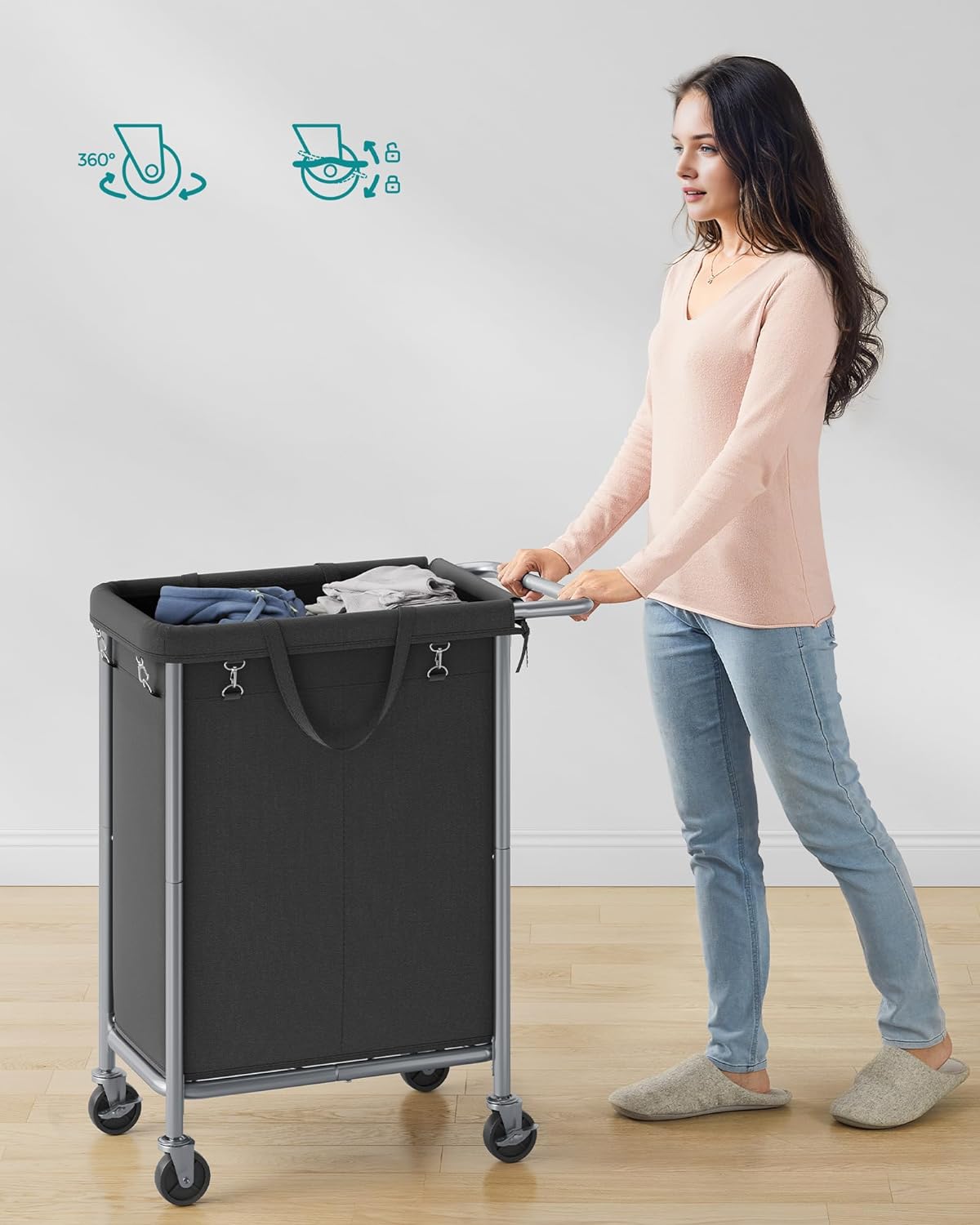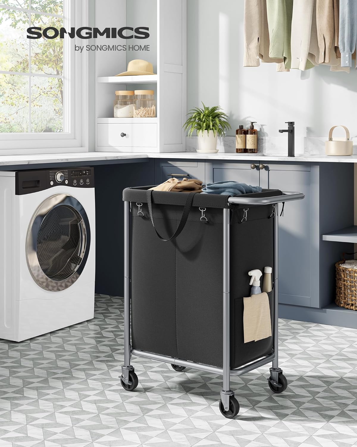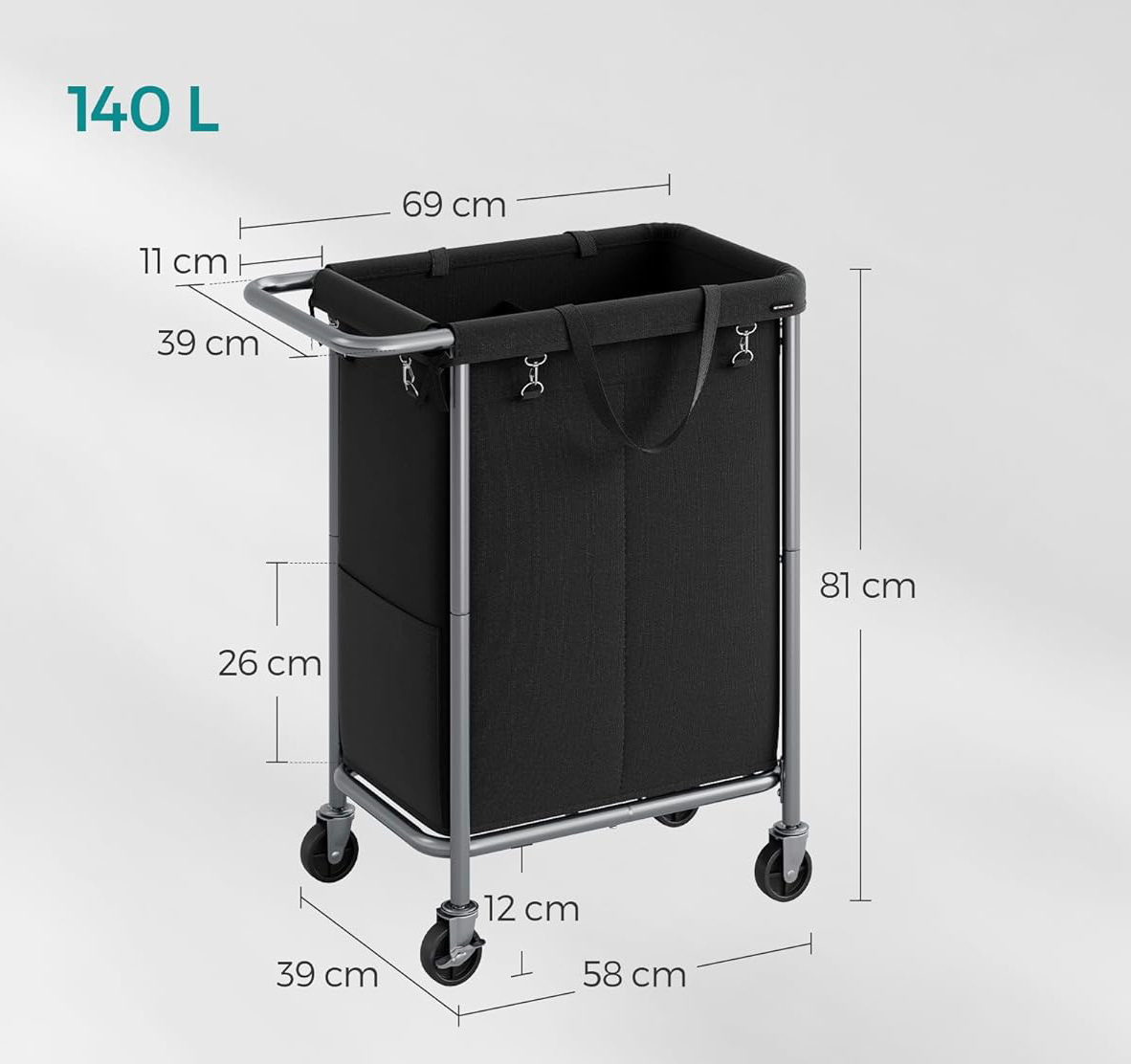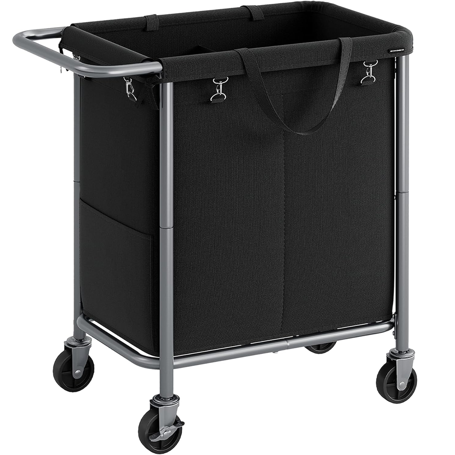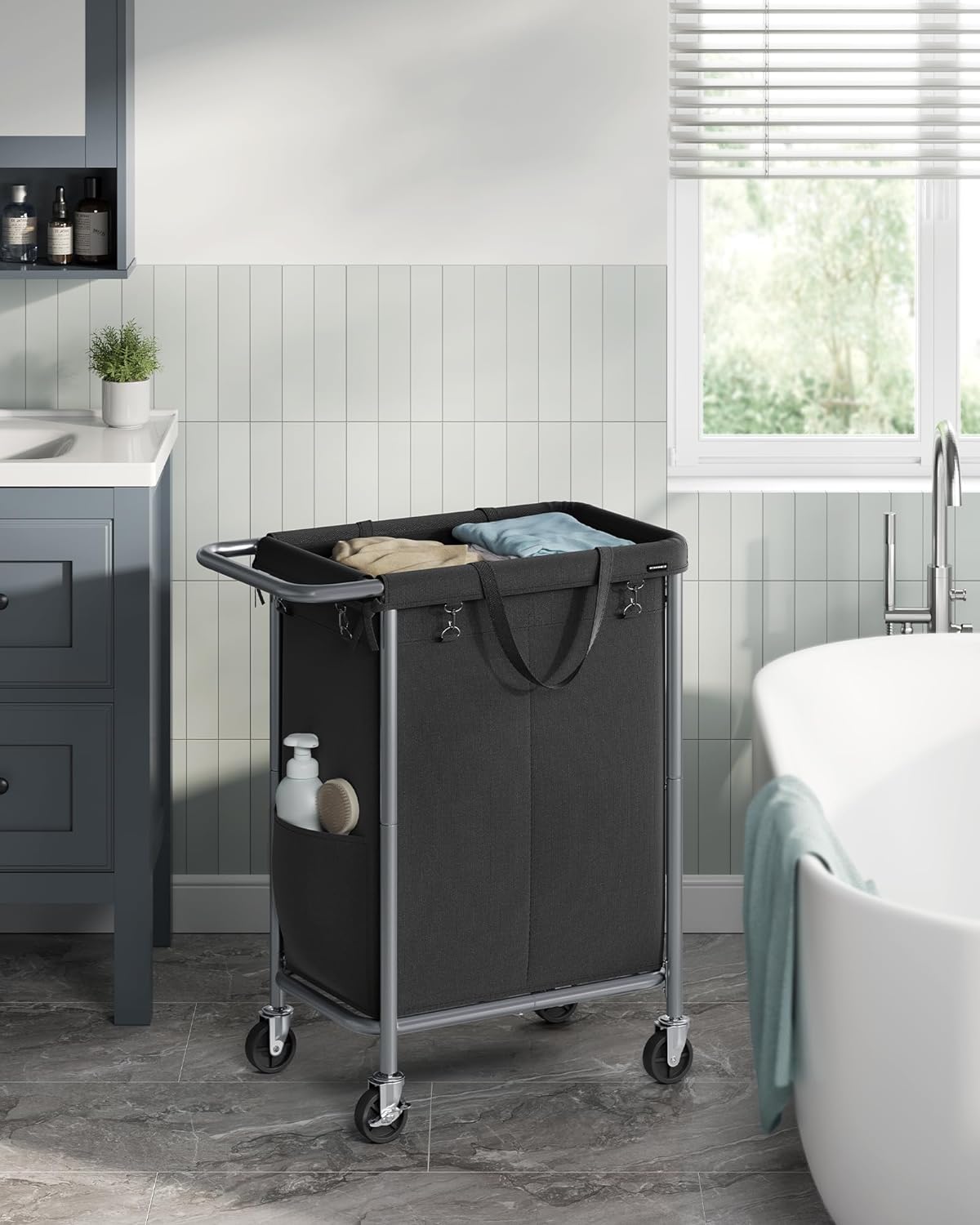 SONGMICS Cos de rufe cu roti, cadru din otel, sac detasabil cu 2 compartimente, 140 litri, 69x39x81cm, negru