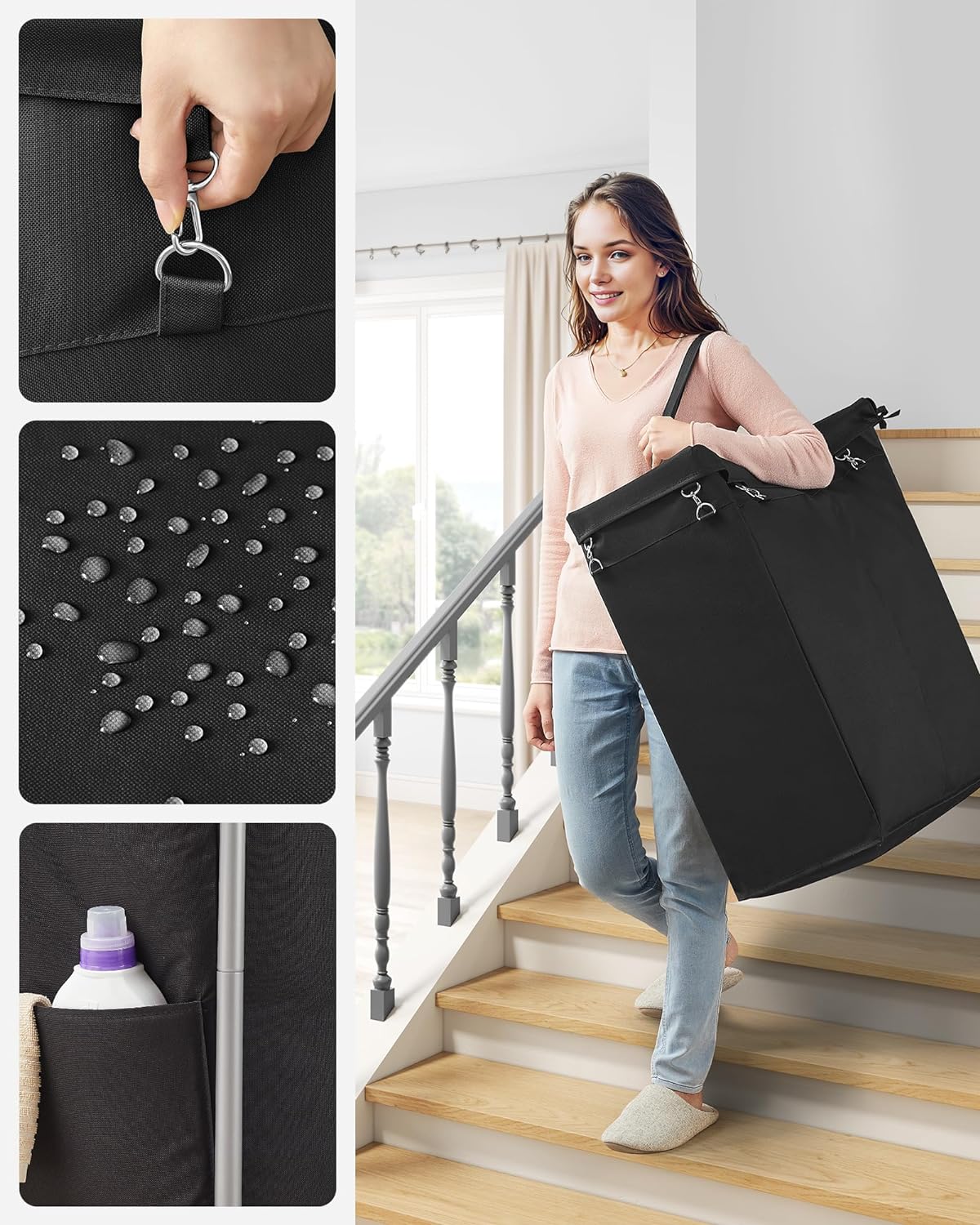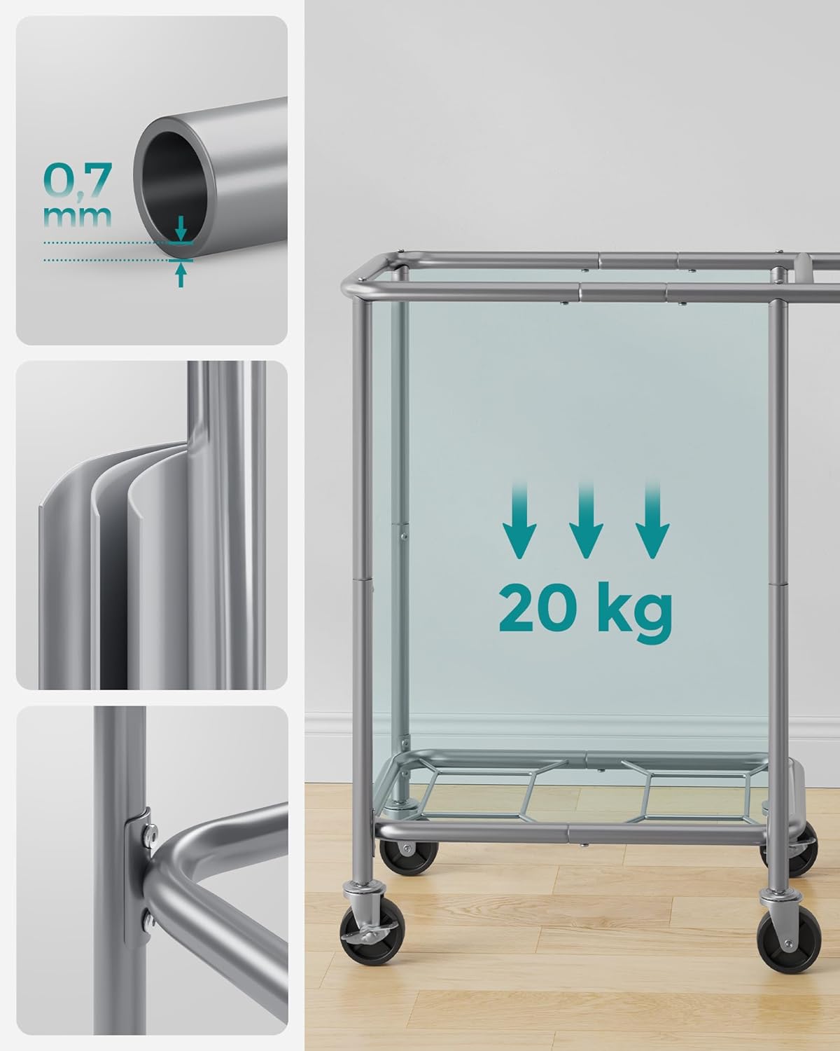 Detalii despre produs: Culoare: Negru Material: Tuburi de otel Ø 22 mm, tesatura Oxford 600D Dimensiuni: 69 x 39 x 81 cm (L x l x a) Greutate: 5,1 kg Capacitate maxima de incarcare statica: 20 kg Despre acest articol Cu o dimensiune de 69 x 39 x 81 cm si doua compartimente de 70 de litri, acest cos de rufe ofera suficient spatiu de depozitare pentru a depozita rufele sortate. Sacul cosului de rufe poate fi indepartat cu usurinta si poate fi transportat confortabil pe scari cu ajutorul manerelor. Datorita elementelor de fixare atasate, puteti fixa sacul de rufe in mod ferm pe cadru.Fabricata din tuburi groase de otel cu diametrul de 22 mm, structura cosului de rufe este stabila si fara oscilatii. In plus, caruciorul de rufe poate sustine pana la 20 kg. Datorita celor 4 roti, dintre care 2 cu frana, acest cos de rufe poate fi deplasat si blocat cu usurinta. In plus, cosul de rufe are un maner care se afla la o inaltime confortabila, astfel incat nu trebuie sa va aplecati atunci cand il impingeti.Durabil si hidrofug: Sacul fabricat din tesatura Oxford 600D de inalta calitate este rezistent la rupere si, prin urmare, durabil. Interiorul sau este, de asemenea, echipat cu un strat hidrofug si este usor de curatat.