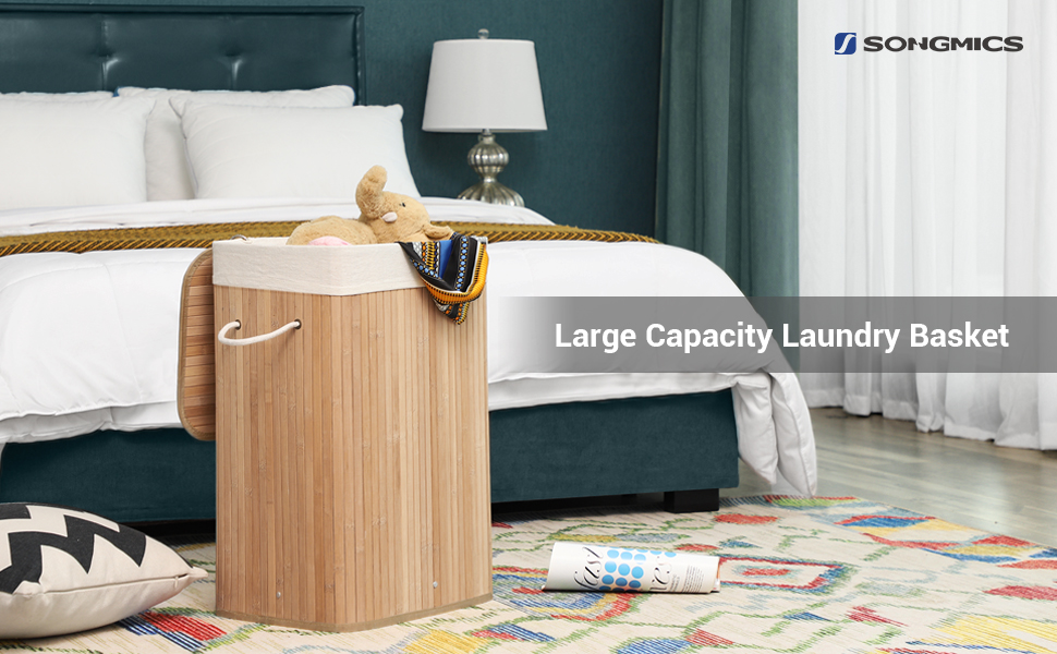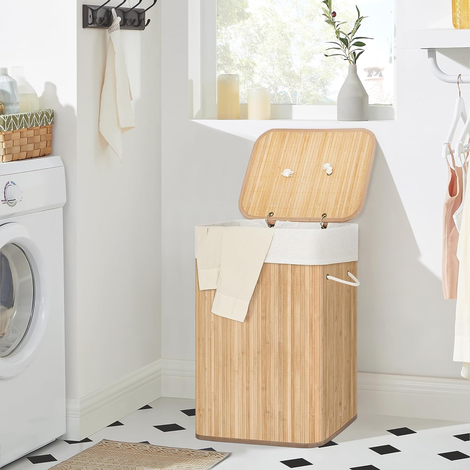SONGMICS Cos de rufe din bambus, pliabil, cu captuseala detasabila lavabila, 72L, 40x30x60cm, natural