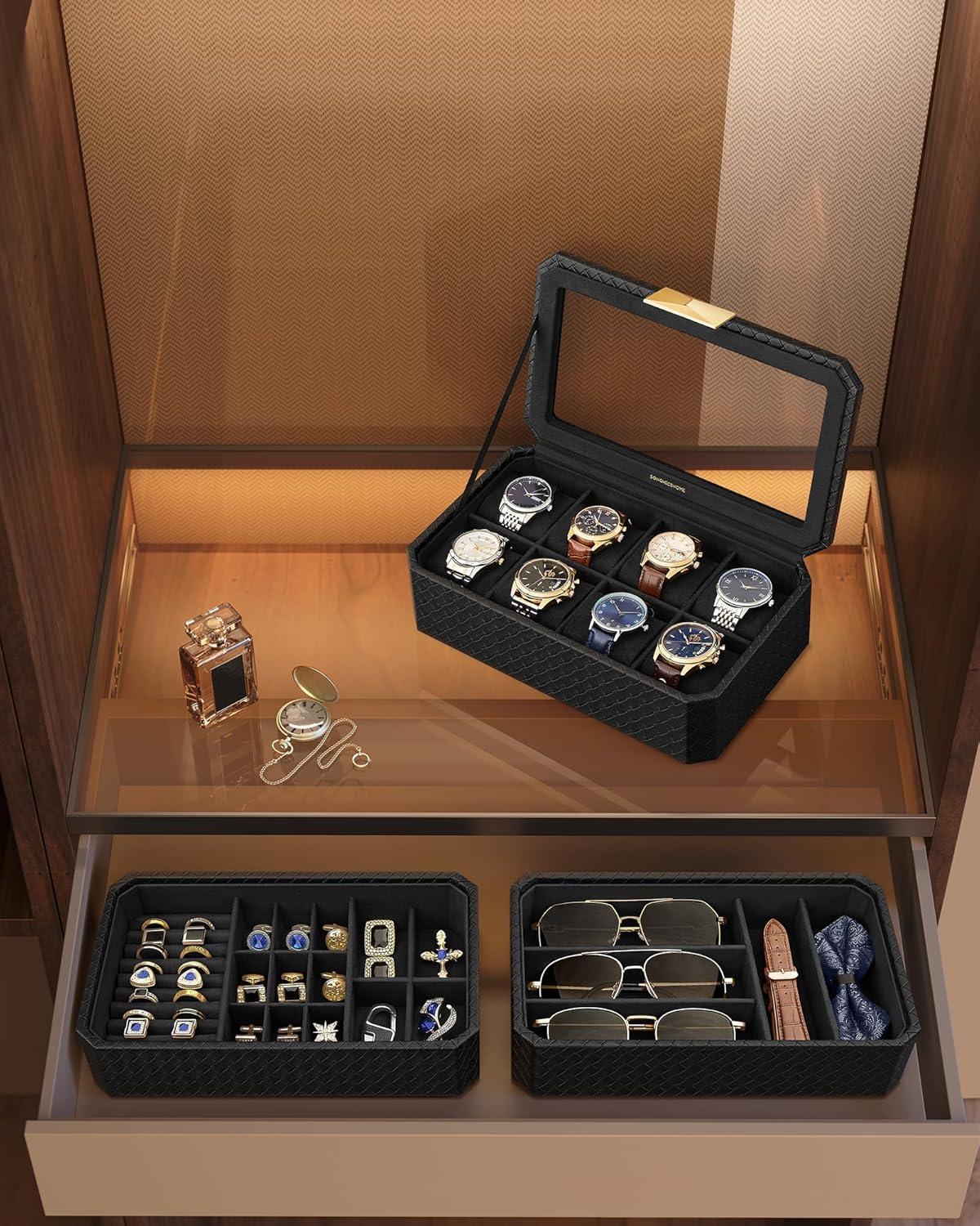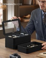 SONGMICS Cutie bijuterii si ceasuri Ronne, 3 niveluri, capac sticla, 27x20x16 cm, negru texturat