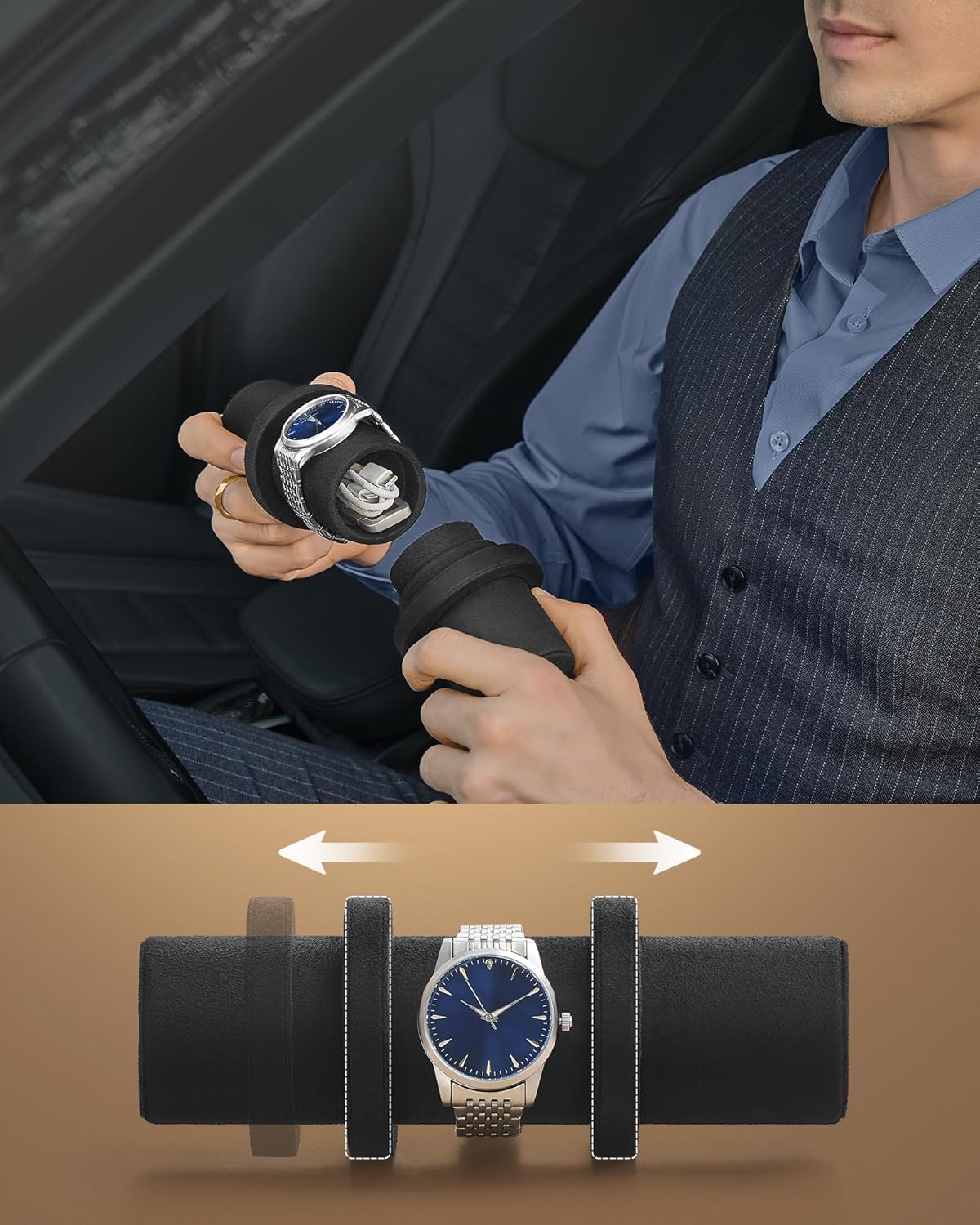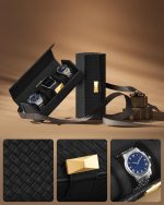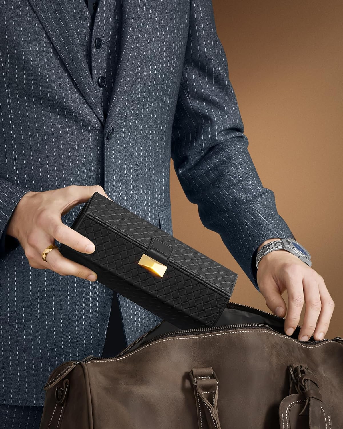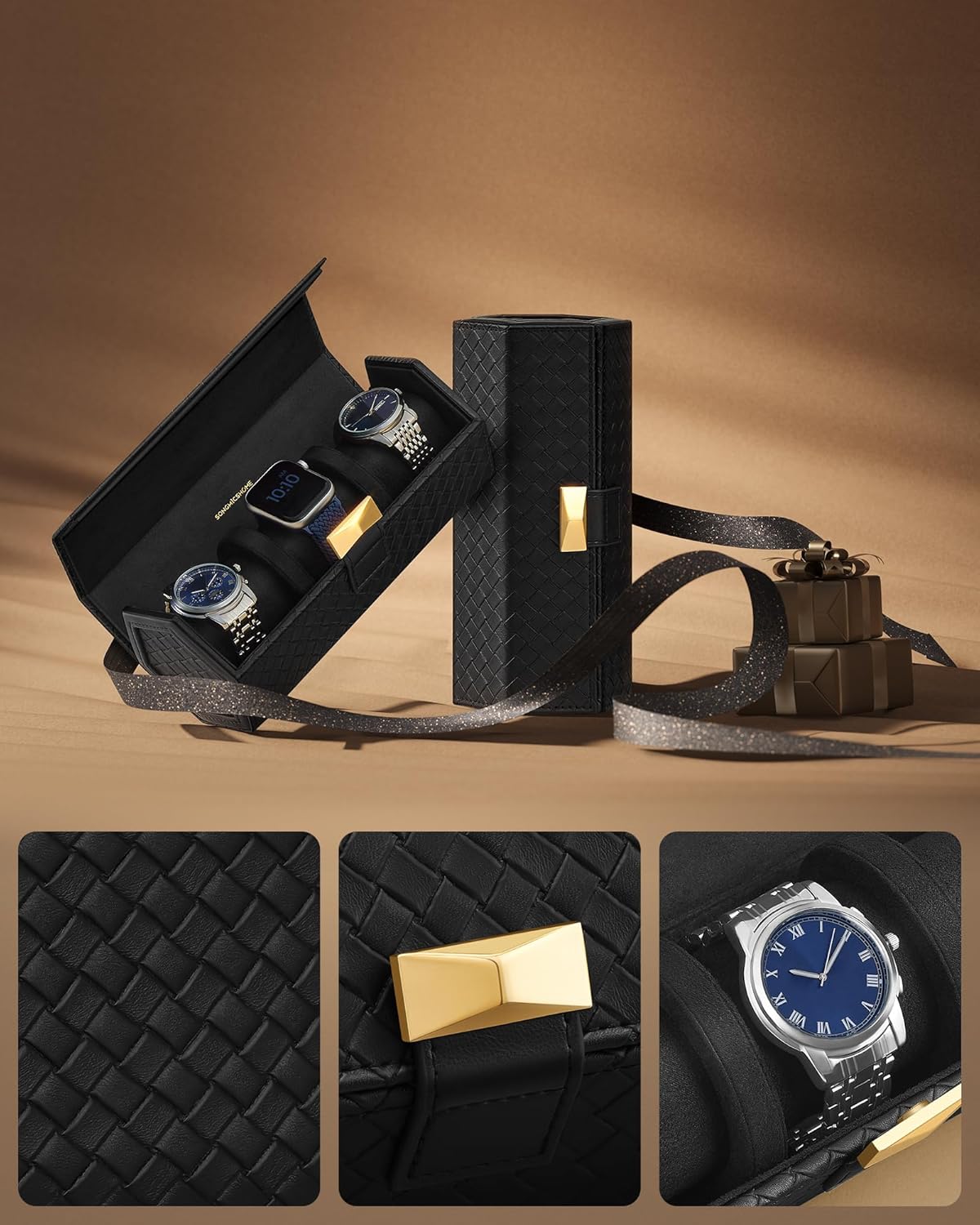 SONGMICS Cutie voiaj ceasuri Ronne, 3 compartimente + spatiu ascuns, 21x10x9 cm, negru