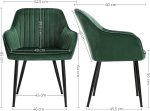 Culoare: verde Material: picioare din metal acoperit cu pulbere, blat din lemn, velur, umplutura din spuma Dimensiuni generale: 62,5 x 60 x 85 cm (L x l x i) Inaltimea scaunului: 50 cm Latimea scaunului: 49 cm Adancimea scaunului: 44,5 cm Inaltimea spatarului: 39,5 cm Inaltimea cotierelor: 64 cm Grosimea pernei scaunului: 7 cm Sarcina statica maxima: 120 kg Foarte puternic: Cu cat scaunul este mai stabil, cu atat te poti relaxa mai linistit. Datorita picioarelor metalice incrucisate intarite cu suruburi si picioarelor reglabile, scaunul nostru este foarte stabil (pana la 120 kg).Totul pentru confortul tau: spatar si cotiere inclinate confortabil – scaunul ergonomic iti sustine corpul in mod optim. Suprafata de catifea placut moale, captuseala sezut cu grosimea de 7 cm, sezutul cu latimea de 49 cm – scaunul asigura confort ridicat.O nota de eleganta: suprafata matlasata de catifea in verde si picioare metalice in negru cerneala – scaunul tapitat emana eleganta si ofera casei tale o nota moderna.Usor de asamblat: sunt necesari doar 2 pasi. Pur si simplu strangeti cele 5 suruburi, un scaun este disponibil in doar cateva minute. Astfel economisiti mult timp si efort!Un plus important – versatilitate: scaunul se potriveste in diferite incaperi – in sufragerie sau in bucatarie ca scaun de sufragerie, in dormitor ca scaun de machiaj, in zona de receptie ca sezlong.