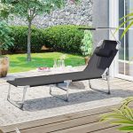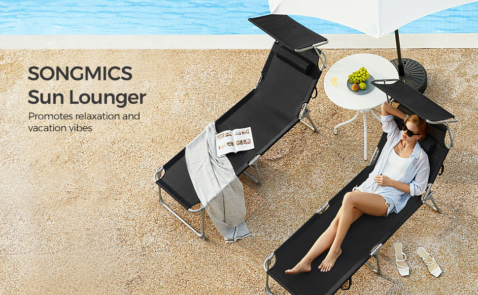 SONGMICS Sezlong pliabil, cu parasolar si tetiera, spatar reglabil in 4 pozitii, maxim 150kg, 193x53x29cm, negru
