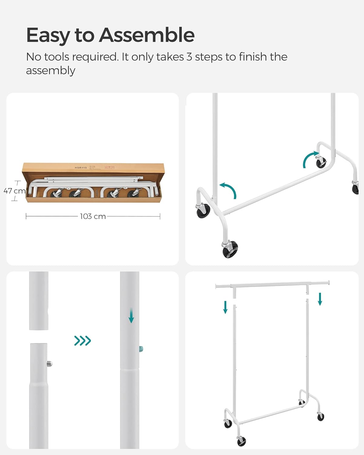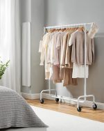 SONGMICS Suport pentru haine extensibil pe roti, bara reglabila 110-150 cm, stil industrial, 150x45x160 cm, alb mat