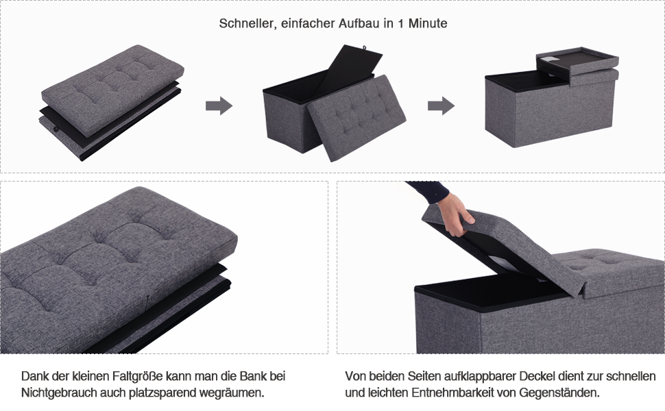 Dimensiunile produsului: ‎76 x 38 x 38 cm; Greutatea maxima recomandata: 300 de kilograme Material: MDF Despre acest articol Banca pliabila cu capac rabatabil – Capacul este rabatabil din ambele parti, convenabil si rapid pentru a scoate sau a introduce articole fara a scoate intregul capac. Cand nu este folosit, il puteti plia si depozita pentru a economisi spatiu.Spatiu mare de depozitare – scaunul cu interior de 80 L ofera suficient spatiu pentru depozitarea oglinzilor, perne, paturi, haine, reviste etc.Capacitate mare de incarcare si confort excelent al scaunului – Capacitate de incarcare statica: 300 kg, 2 persoane se aseaza lejer pe el, tapiteria din faux-in gri inchis asigura o senzatie buna de asezare si se potriveste perfect cu toate stilurile de casa.Solida si durabila – Banca din panouri MDF (clasa E1) asigura o stabilitate ridicata, ca piesa de mobilier indispensabila, serveste perfect ca banca pentru pantofi, suport pentru picioare sau canapea extensibila.Usor de asamblat si versatil – asamblare rapida in 1. Min. Datorita celor 3 parti simple, ideale pentru living, dormitor, vestiar sau hol.