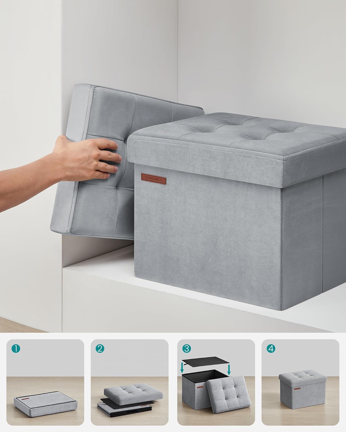 SONGMICS Taburet pliabil cu spatiu de depozitare, catifea matlasata, 31x41x31 cm, 130 kg, gri