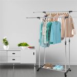 Suport pentru haine pe roti, sina dubla, reglabil pe inaltime si latime, din aluminiu cromat, 155x45x150cm, argintiu