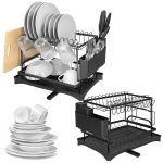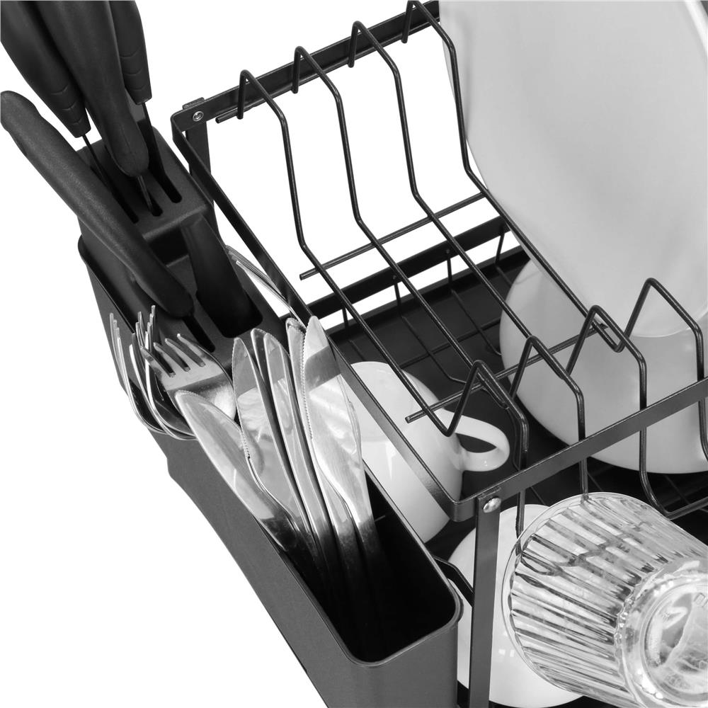Specificatii tehnice Material: Otel, plastic Culoare: Negru Dimensiuni totale: Lungime 42 cm, latime 30 cm, inaltime 31,5 cm Dimensiuni tava scurgere: 42x30x4 cm Lungime scurgere reglabila: 11-19 cm Dimensiuni nivel 1: 36x29x10,5 cm Dimensiuni nivel 2: 37×27,5×20 cm Distanta intre niveluri: 2,5 cm (baza – nivel 1), 20 cm (nivel 1 – nivel 2) Dimensiuni compartimente suport vase: 2,5×8,5 cm; 2×6,5 cm; 4×2,5 cm; 3×2,5 cm Dimensiuni suport tacamuri: 25,5x5x10,5 cm Dimensiuni orificii tacamuri: Lungime 2,5 / 3,8 / 4,6 cm; diametru 4 / 17,5 mm Grosime rame si tuburi: Rame tava 4 mm, rame suport 2 mm, tuburi structura 1,8 / 2 / 2,3 / 2,5 / 4 mm Scurta descriere Suport de vase pe 2 niveluri, cu tava de scurgere si suport detasabil pentru tacamuri, ideal pentru uscarea eficienta a farfuriilor, paharelor si ustensilelor. Construit din otel rezistent cu finisaj negru si elemente din plastic de calitate, are un design elegant, capacitate mare si este usor de curatat. Caracteristici principale Structura stabila si rezistenta 2 niveluri pentru uscarea vaselor Suport detasabil pentru tacamuri Suport lateral pentru prosop sau tocator Capacitate mare de organizare