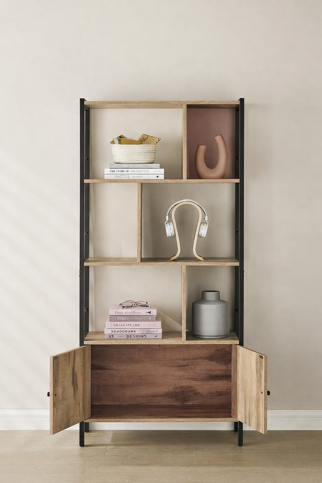 VASAGLE Biblioteca cu 4 rafturi si dulap inferior cu 2 usi, stil industrial, 74x30x155cm, stejar