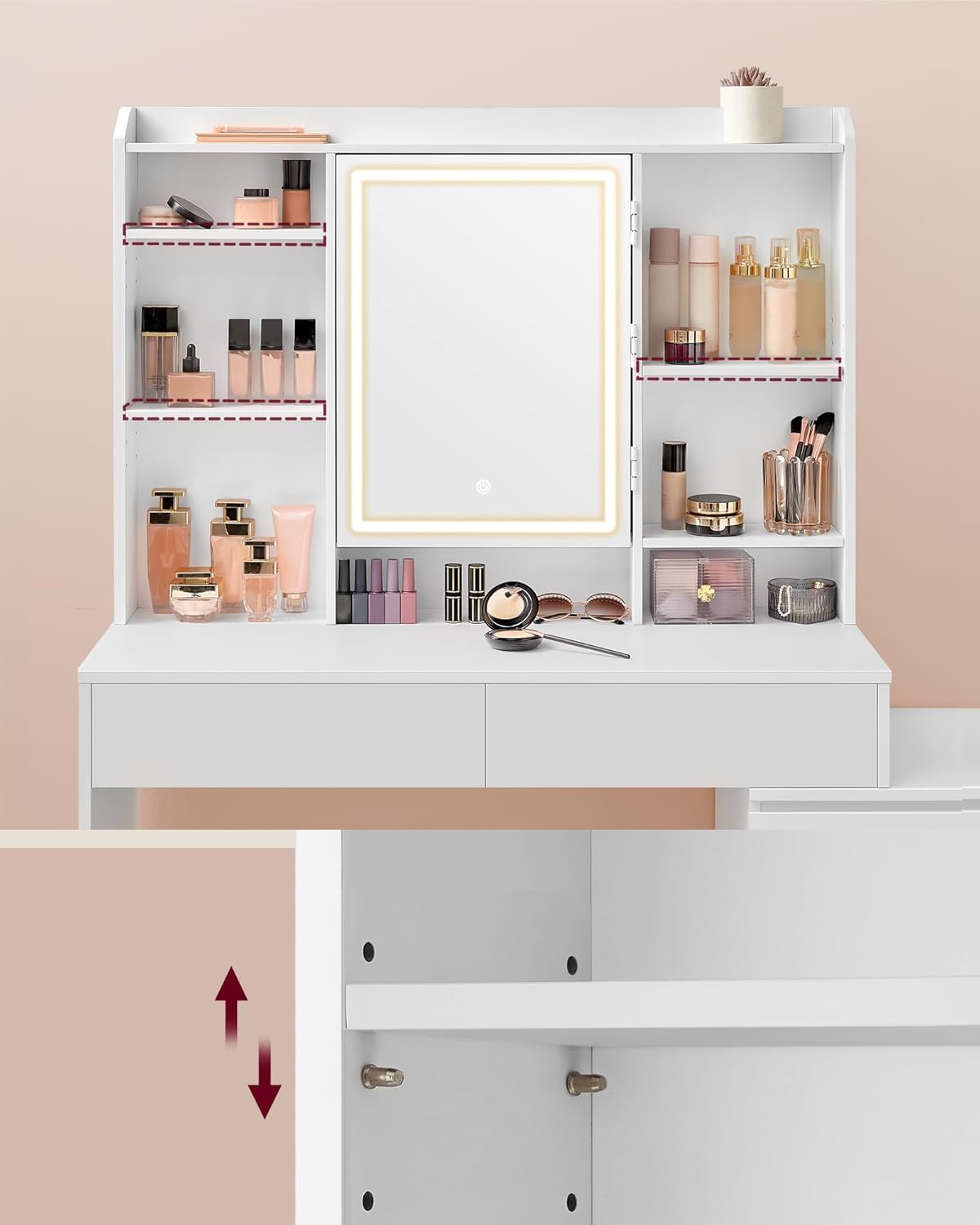 VASAGLE Masa de toaleta cu oglinda, iluminare LED reglabila, 6 sertare, 118x40x145 cm, alb