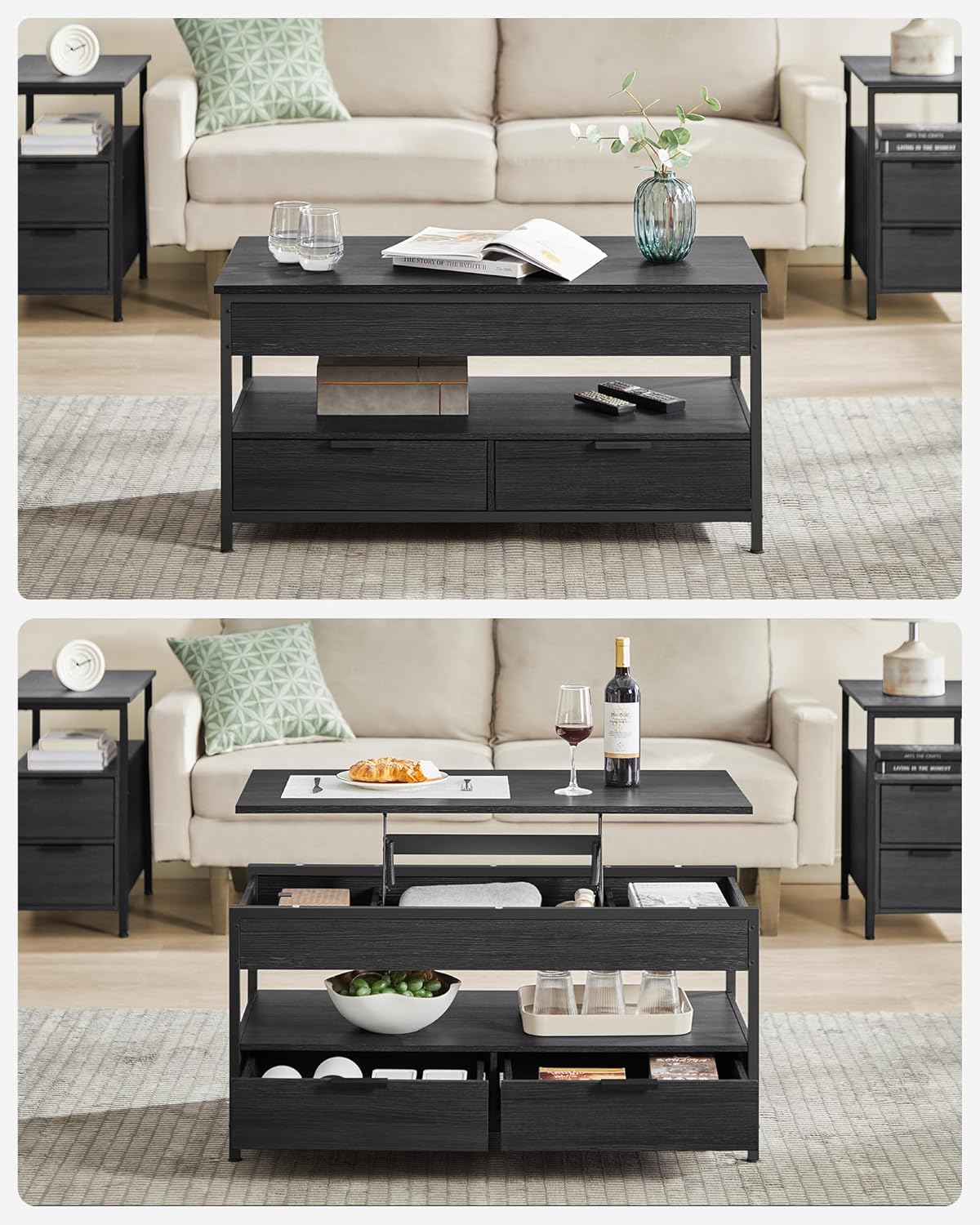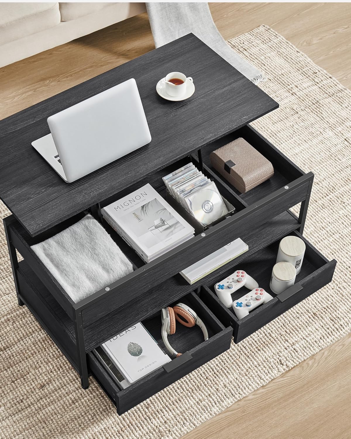 VASAGLE Masuta de cafea cu blat reglabil pe inaltime, cu sertare si spatii de depozitare, stil industrial, 100x50x63 cm, gri antracit