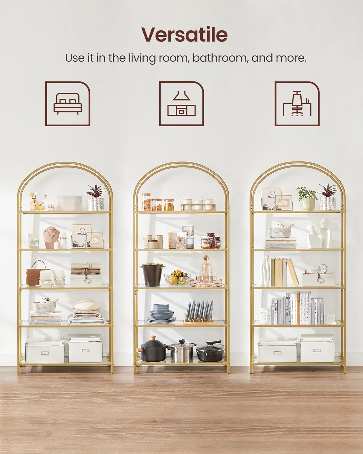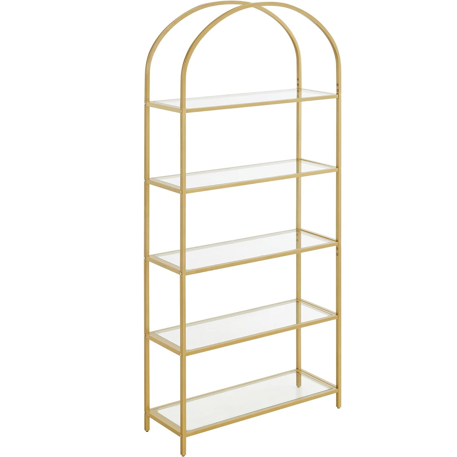 VASAGLE Raft cu trepte pentru dormitor, 5 etaje, din sticla securizata, cadru din otel cu arcada, 83x30x184cm, auriu