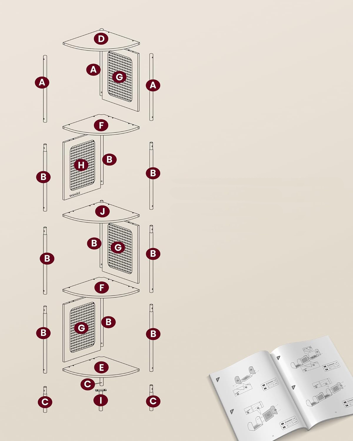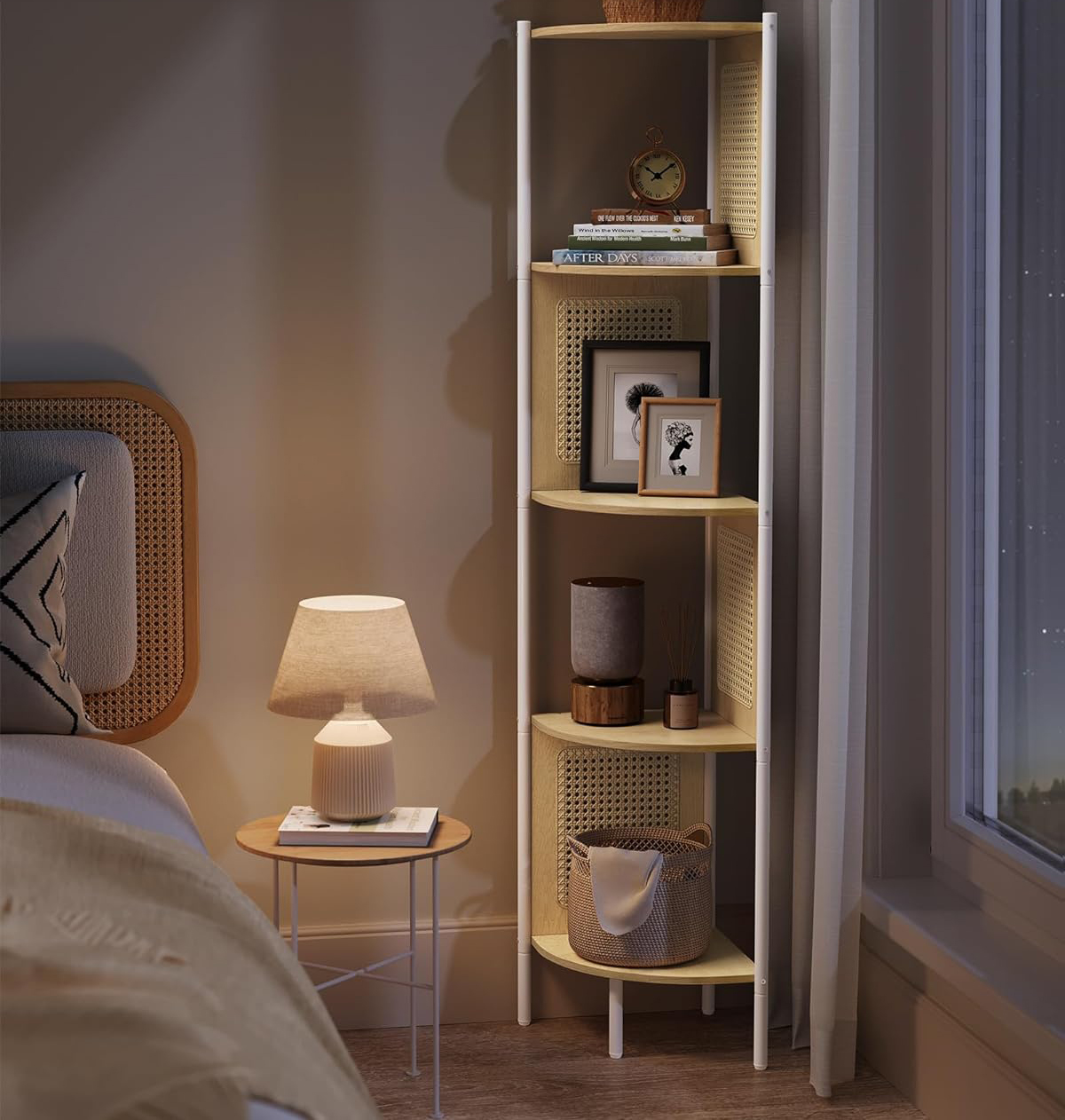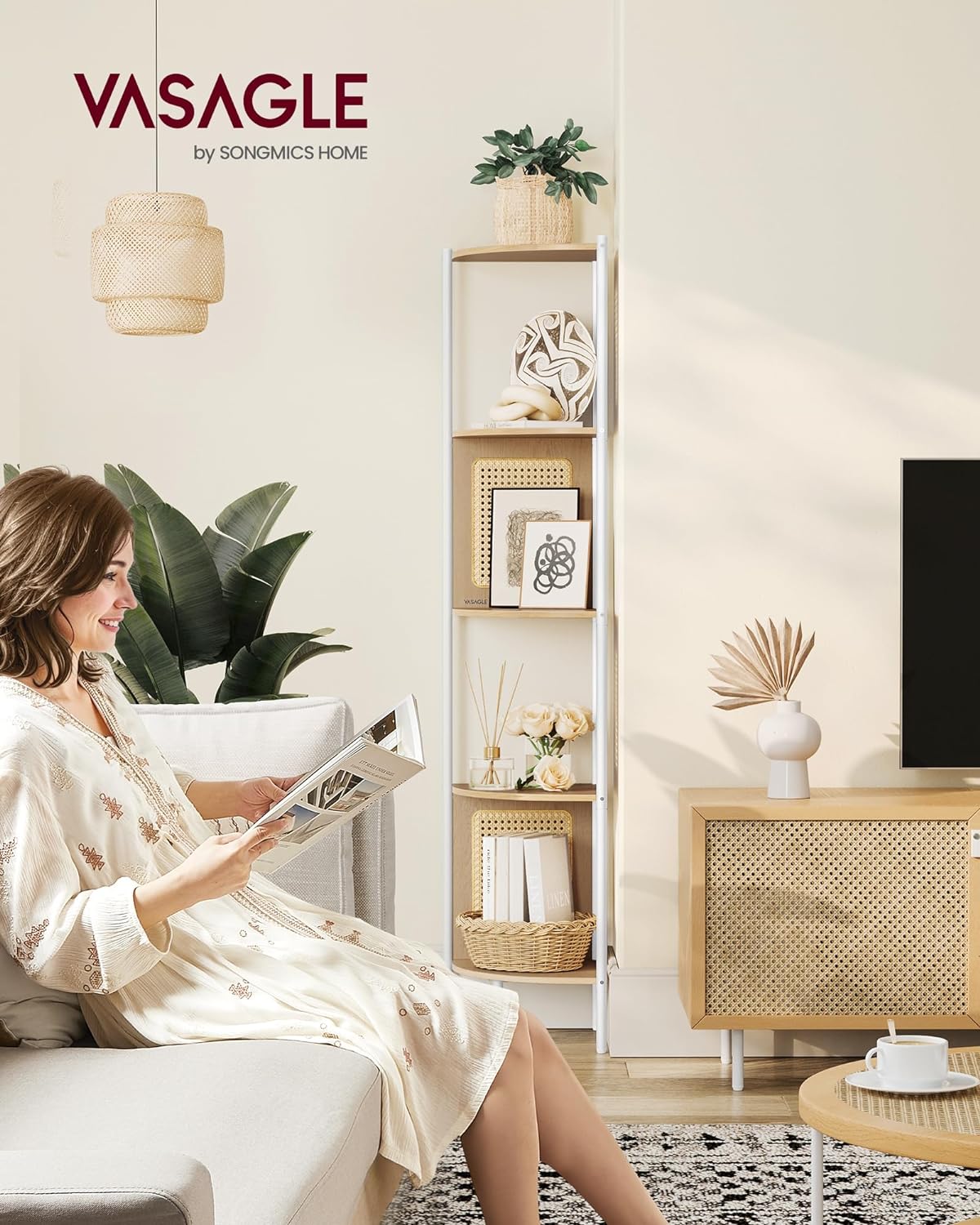 VASAGLE Raft de colt boho, cadru metalic, polite MDF si panouri poliratan, 32x32x156cm, bej