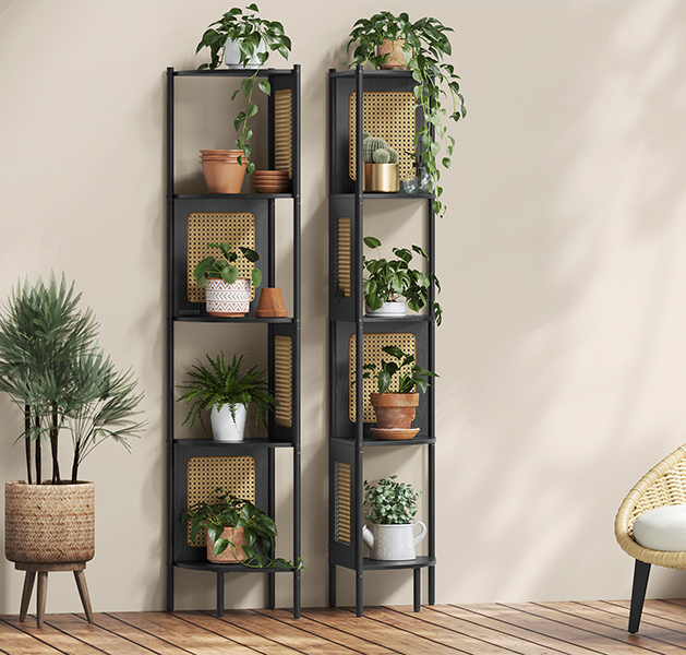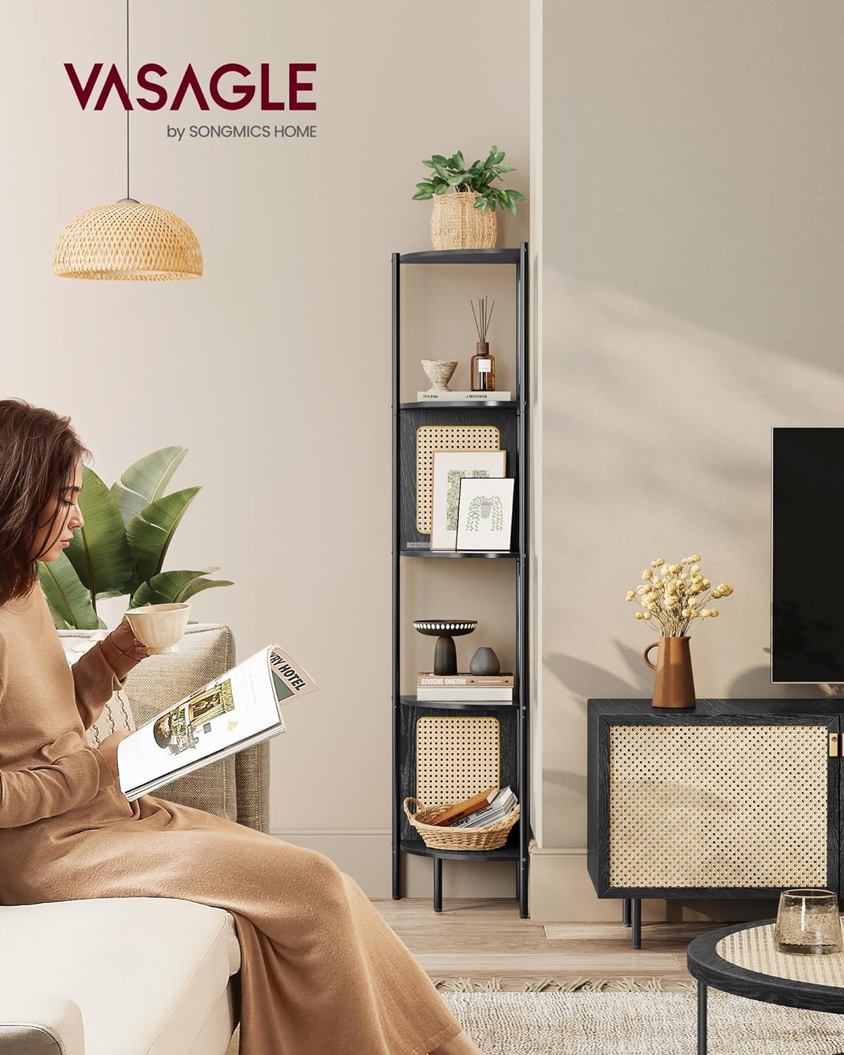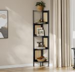 VASAGLE Raft de colt boho, cadru metalic, polite MDF si panouri poliratan, 32x32x156cm, negru