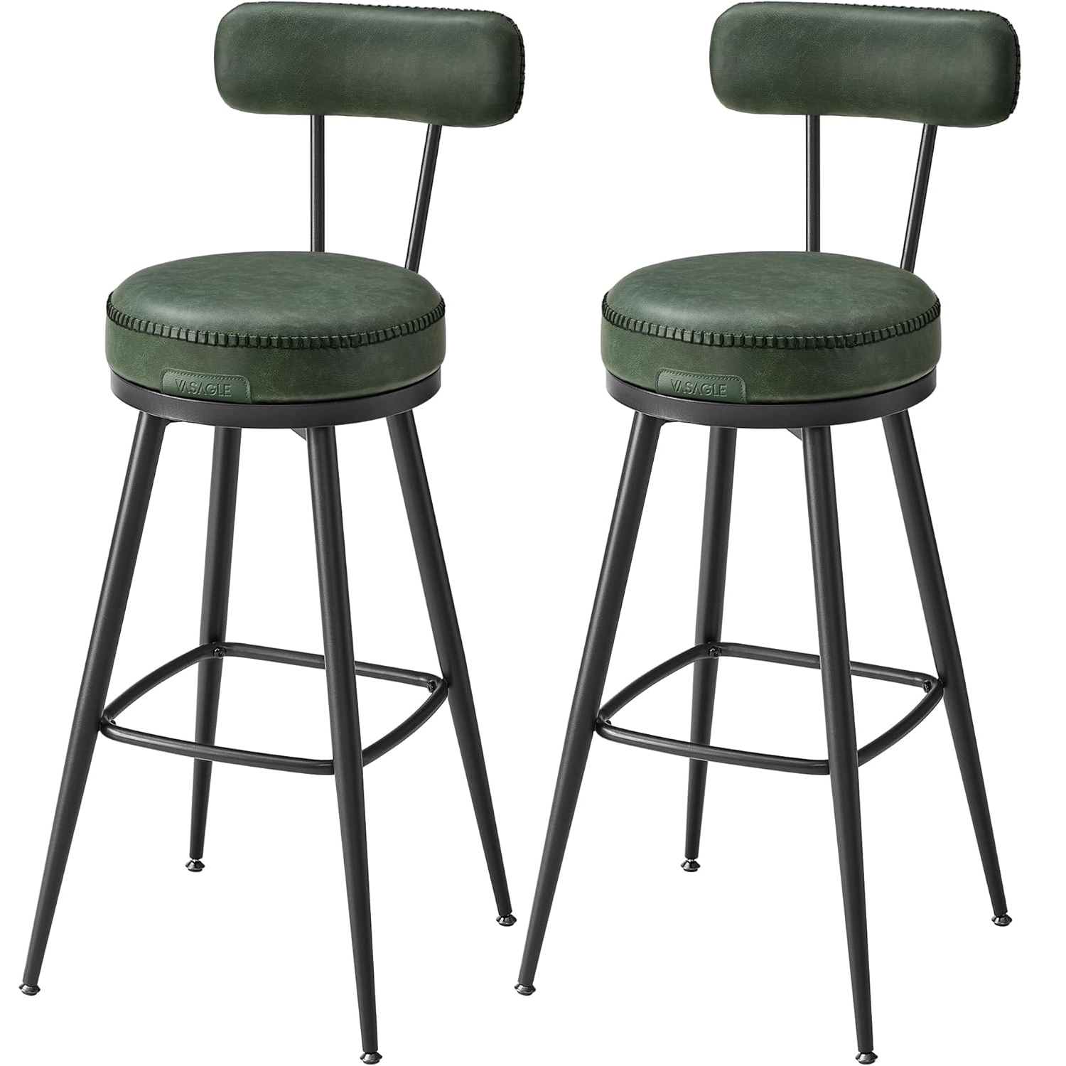 VASAGLE set 2 scaune de bar rotative 360°, cu spatar, inaltime 101 cm, piele sintetica, cadru otel, stil modern, verde