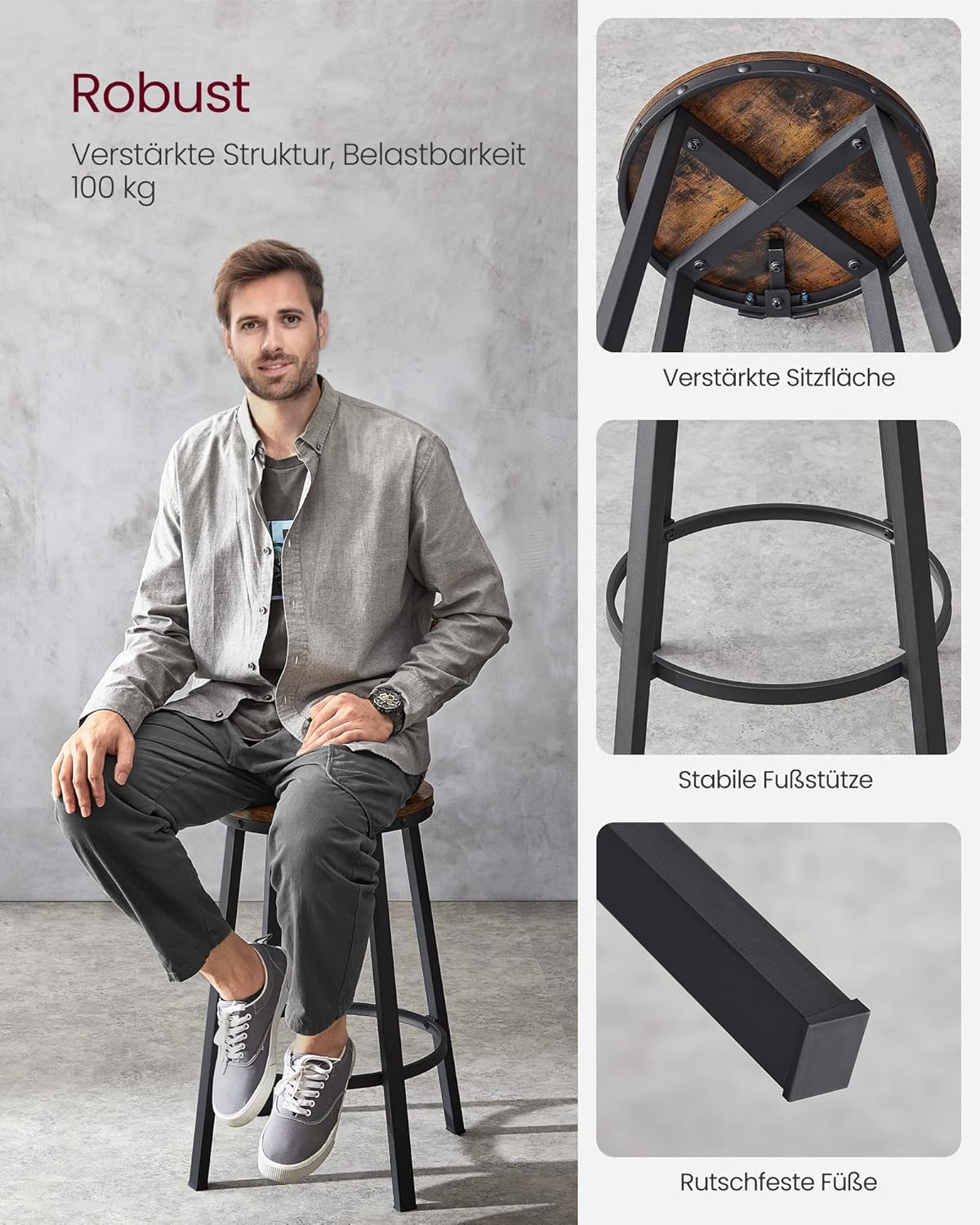 Specificatii: Culoare: Maro rustic, negruMaterial: PAL, otelDimensiuni totale: 50,6 x 88,5 cm (diametru x inaltime).Diametrul scaunului: 37 cm.Inaltimea scaunului: 62,5 cm.Greutate totala: 11,7 kg.Max. Capacitate de incarcare statica per scaun: 100 kg Continutul pachetului: 2 x taburet de bar1 x Kit de asamblare1 x Instructiuni Note VASAGLE: Acest produs este destinat exclusiv utilizarii la domiciliu.Din motive de siguranta, copiii nu trebuie sa se urce pe produs sau sa se joace cu el.Capacitatea de incarcare statica a fiecarui taburet este de 100 kg. Va rugam sa nu depasiti limita de greutate a acestuia. Stabil Baza scaunului este intarita, suportul circular pentru picioare este sudat in siguranta, iar placutele antiderapante cresc frecarea pe podea. Aceste 2 scaune de bar industriale sunt stabile si rezista pana la 100 kg fiecare Confortabil pentru sedere Cu un scaun mare cu diametrul de 37 cm si un suport convenabil pentru picioare, acest set de scaune de bar va ofera un confort dublu Confortabil sa va sprijiniti Spatarul curbat este proiectat ergonomic pentru a se potrivi spatelui dvs. Cu un suport din otel ingrosat, spatarul este stabil si nu se va clatina Stil rustic Cu o suprafata maro, cadru din otel negru si accent de nit, aceste scaune inalte in stil industrial sunt perfecte pentru zona dvs. de bar, bucatarie, sufragerie si multe altele Asamblare rapida Pur si simplu puneti piesele numerotate impreuna in conformitate cu instructiunile ilustrate, ceea ce face ca asamblarea sa fie rapida